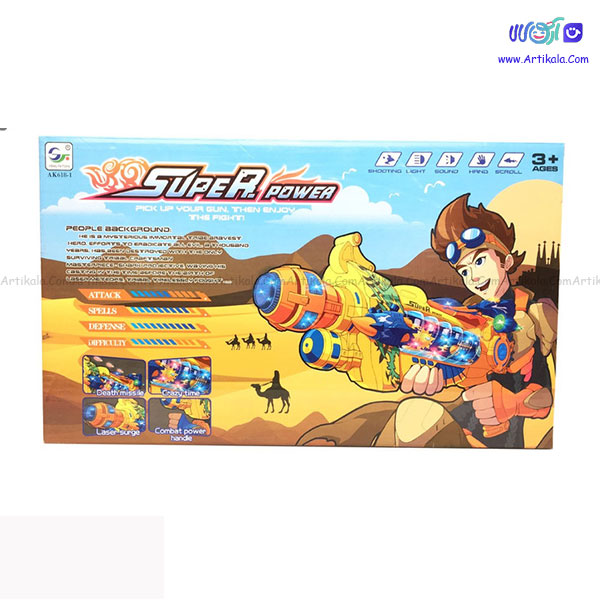 این تفنگ دارای افکت های صوتی بسیار جذابی است. لرزش و نور هنگام تیر اندازی، حس داشتن یک تفنگ واقعی را به کودک میدهد. همراه تفنگ پایه مخصوص برای قرار دادن تفنگ روی آن وجود دارد. تفنگ پیش روی شما تنها با قرار دادن 2 عدد باتری قلمی روشن میشود.